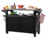 La desserte "Unity XL" en dimensions : L. 134 x l. 52 x H. 90 cm. En résine polypropylène aspect bois résistant au UV et aux intempéries, coloris gris anthracite. Avec 2 portes cadenassables (cadenas vendu séparément) 1 poignée barreau latérale en acier inoxydable avec crochet de suspension, 1 étagère, 2 roulettes sous pieds de droite pour faciliter le déplacement. Capacité de stockage total : 270 L.