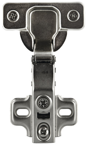 Charnière invisible. Boîtier acier nickelé Ø 35 mm avec tourillons. Entraxe 45 m. Bras acier nickelé avec ressort. À visser sur l'embase. Ouverture 110°. Embase croix hauteur 4 mm avec eurovis. Visserie fournie. Pour porte à recouvrement. Sachet de 2 pièces.