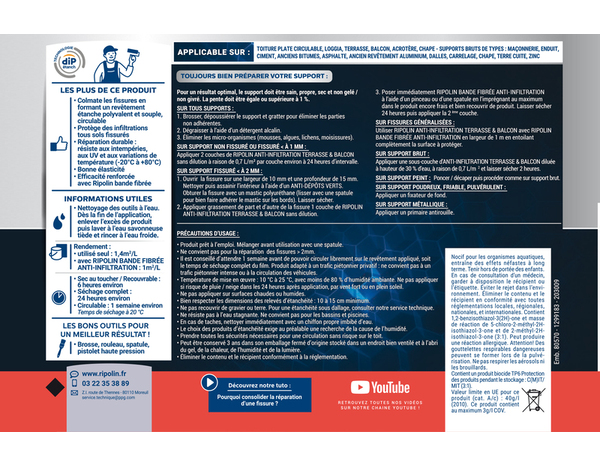 L’anti-infiltration terrasse & balcon - Gris - 5L Issu de la technologie DIP étanch®. Ce revêtement polyvalent et souple permet de colmater les fissures, défauts de raccordement et relevés d’étanchéité sur toutes surfaces extérieures circulables. Son action 3 en 1 permet de rénover, protéger et décorer vos sols extérieurs en formant un film 100% étanche résistant à la fissuration, à l’encrassement et au trafic piétonnier privatif, ainsi qu’aux agressions climatiques (intempéries, UV et variations de température).