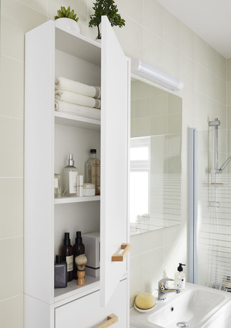 Caisson en PPSM* épaisseur 16 mm. Façade en MDF** épaisseur 16 mm. Finition extérieur et intérieur en feuille de polypropylène. 1 porte à fermeture amortie avec poignée en frêne. 2 tablettes ajustables en PPSM*. Charnières de porte en métal. Dimensions : L. 40 x H. 90 x P. 15 cm. Informations fournisseurs : Nom : Kingfisher International Products B.V Adresse : Rapenburgerstraat 175E, 1011 VM Amsterdam, The Netherlands Site web :www.kingfisher.com/products