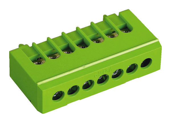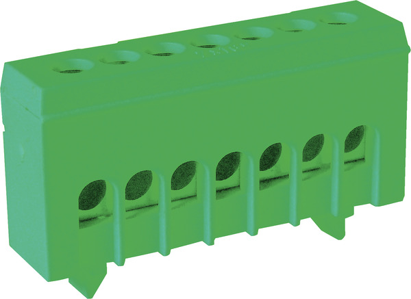 Bornier 7 bornes. Terre 7 x 16. Capacité 1,5 à 16 mm². Clipsable sur rail DIN. IP2X.