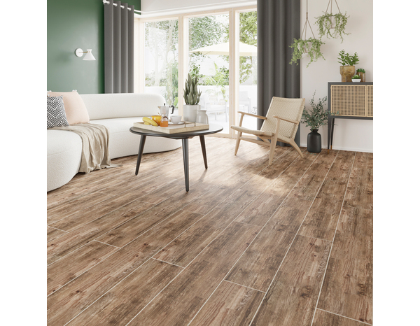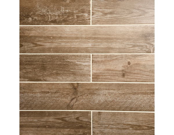Carrelage de sol intérieur grès cérame émaillé "Cottage Wood" marron adapté pour les pièces d'intérieurs telles que la salle de bains et la cuisine.