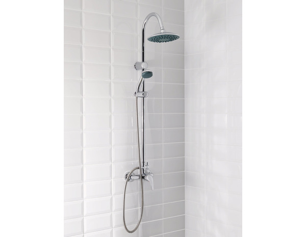 . Mitigeur mécanique, inverseur 2 fonctions . Barre inox Ø20mm, hauteur 95cm, fixations ajustables . Pomme de tête ABS Ø20cm avec picots anticalcaire et réducteur de débit 12L/mn . Douchette ABS chrome 1 jet et réducteur de débit 8L/mn . Flexible inox 1,50m