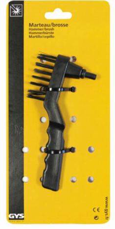 Combiné marteau et brosse à soudure. Cet outil 2 en 1 est composé d'un marteau pour vous permettre d'enlever le laitier, et d'une brosse pour nettoyer vos pièces en fin de soudure. Informations fournisseurs : Nom : GYS Email : contact@gys.fr Adresse : 1, rue de la Croix des Landes - CS 54159, 53941 SAINT BERTHEVIN France