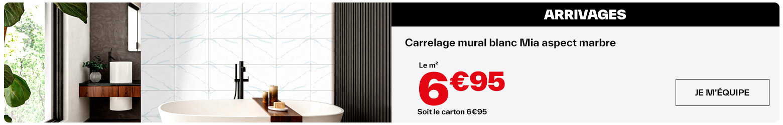 Vous souhaitez renouveler la faïence d’une cuisine ou d’une salle de bains ? Nos magasins Brico Dépôt et la boutique en ligne vous proposent une vaste gamme de faïences pour répondre à toutes vos envies déco. Aspect béton, revêtement mat ou haute brillance, jeux de reliefs, impression carreaux de ciment, mosaïques, tuiles de métro… vous n’aurez que l’embarras du choix parmi nos modèles. Créez la décoration qui vous ressemble en optant pour un mur de faïence monochrome, en associant les motifs, les formes et les couleurs, ou encore en ajoutant un listel ou une frise.Utilisez de la colle carrelage et joint carrelage pour assembler votre carrelage mural.