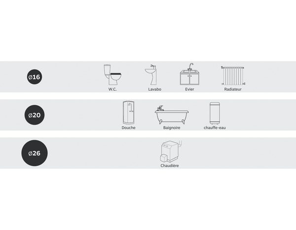 Usage : Pour la réalisation de réseau d'eau sanitaire ou chauffage/climatisation. Raccordement en apparent (chauffage traditionnel et sanitaire) et en encastré. Adapté à l'eau chaude.