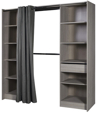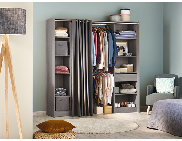Le dressing imitation chêne grisé "Eklips 2" en PPSM*, ép. 16 mm. Dimensions : H. 200 x L. de 100 à 200 x P. 48 cm. Il est possible d'intervertir les 2 colonnes. En plus d'être esthétique, le rideau protège vos vêtements. Les étagère peuvent supporter jusqu'à 26 Kg. Composé de :