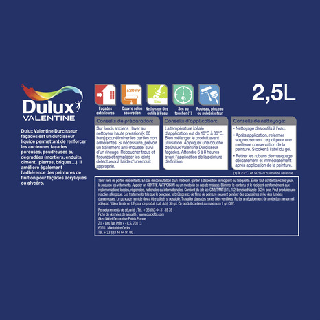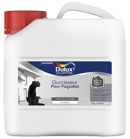 Le durcisseur de façade blanc Dulux Valentine 2,5 L, peut être appliqué sur du plâtre ou du ciment nu et sur d'ancienne peintures acryliques, à base de solvant ou d'anciennes peintures de façade. Il est préférable de préparer la surface d'application en enlevant la peinture écaillée ou abîmée puis de poncer la surface pour obtenir une surface brillante. Assurez-vous que la surface soit propre et sèche, puis appliquez une couche du produit au pinceau ou au rouleau pour couvrir toutes les zones encore poudreuse ou poussiéreuses qui resteraient après la préparation de la surface. Finalement appliquez 2 couches de la peinture pour façade de votre choix. Ce durcisseur prêt à l'emploi s'utilise idéalement avec les peintures Dulux dont il améliore la tenue. Il sert également de sous-couche pour les surfaces comportant des problèmes et sur les murs préalablement plâtrés. Ce durcisseur a un rendement jusqu'à 8 m²/L et met 6 à 8 h pour sécher. Informations fournisseurs : Nom : Akzo Nobel Decorative Paints France Email : info.duluxvalentine@akzonobel.com Adresse : Z.I. "Les Bas Prés" C.S 70113, 60761 Montataire Cedex