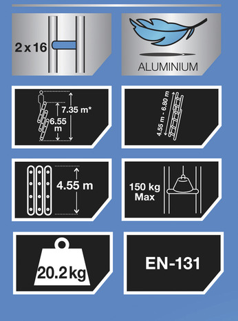 Hauteur de travail max. : 7,35 m. Longueur déployée max. : 6,80 m. Dimensions repliée : H. 4,55 x l. 0,41 x P. 0,15 m. Structure aluminium. Composants en plastique. Usage comme échelle d'appui coulissante. Charge maximale : 150 kg. Poids : 20,2 kg. Conforme à la norme EN131.