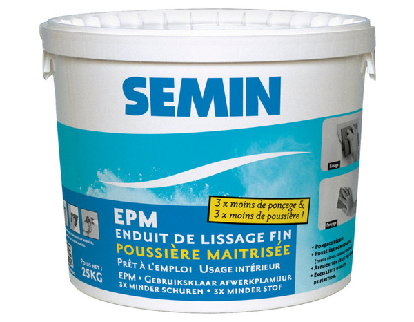 Le SEMIN LISSAGE FIN POUSSIÈRE MAITRISÉE est un enduit de lissage intérieur prêt à l’emploi, idéal pour obtenir une finition impeccable sur murs et plafonds. Facile à appliquer à la spatule, au plâtoir, rouleau ou à la raclette Convient à une grande variété de supports tels que plaques de plâtre, béton ou anciennes peintures Permet de réduire le ponçage grâce à sa poussière non volatile, pour un rendu de haute qualité Sa formule mécanisable garantit une utilisation efficace et rapide, même en couches successives Son temps de séchage varie entre 6 et 24 heures selon les conditions, avec une prise en 120 minutes
