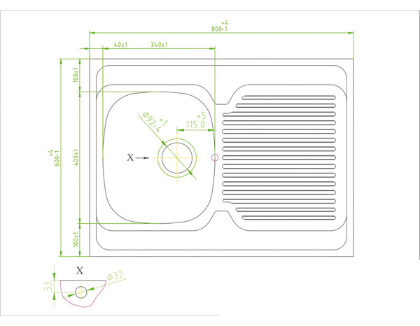 Modèle "MAYR" en inox. Dim: L.80 x l.60 x P.15 cm. Pour meuble sous-évier de 80 x 60 cm. Bonde à panier diam. 90 mm et siphon vendus séparément. Évier sans pré-perçage.