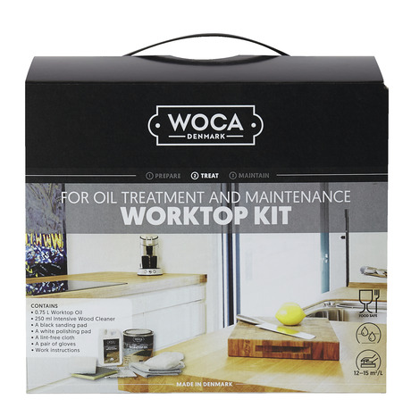 Ce kit de montage et d'entretien pour plan de travail en bois comprend tous les accessoires nécessaires pour installer parfaitement votre plan de travail snack ou plan de travail en bois massif. Inclus : 750ml d'huile pour plan de travail, 250ml de nettoyant puissant pour bois, 1 patin de ponçage noir, 1 patin à polir blanc, 1 chiffon non pelucheux, 1 paire de gants et instructions de travail.