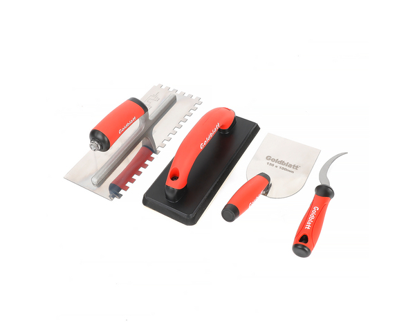 Ce kit de pose pour carrelage se compose de : - 1 taloche à joints en caoutchouc 240 x 100 mm - 1 peigne à colle U9 en acier inoxydable 280 x 115 mm - 1 couteau à enduire en acier inoxydable 130 x 100 mm - 1 grattoir pour anciens joints Tous les outils disposent d'une poignée ergonomique.