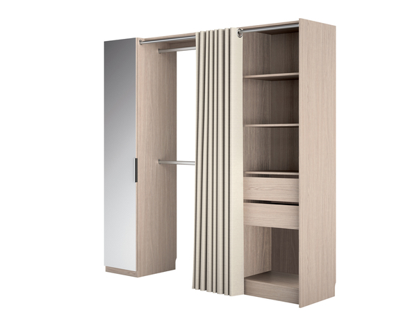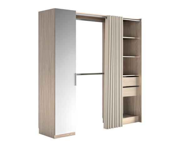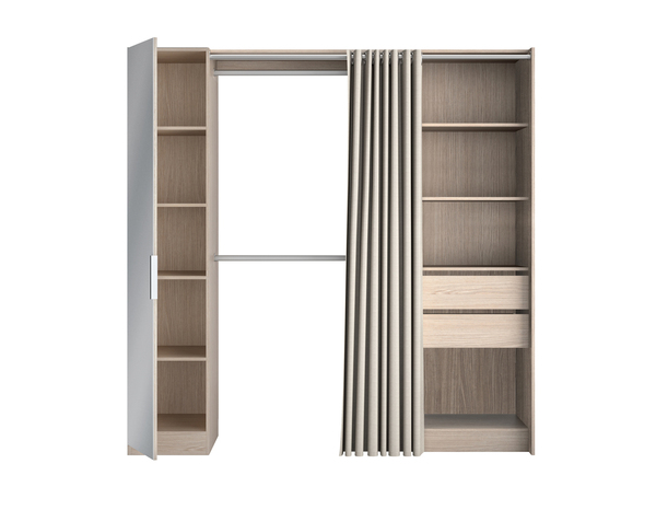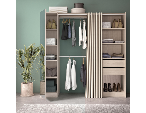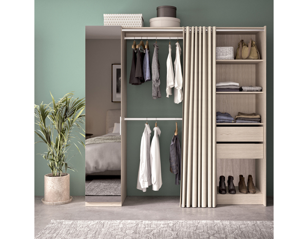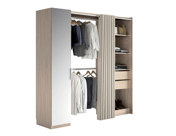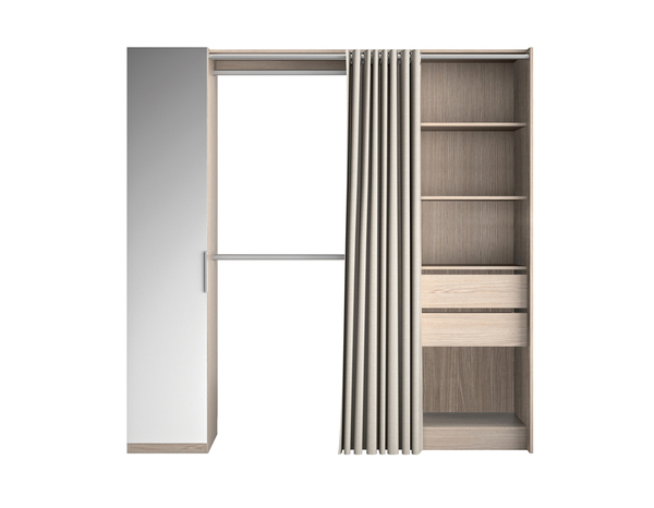 Le dressing imitation chêne clair "Fileas" en PPSM*, ép 16 mm. Dimensions : H. 200 x L. de 100 à 200 x P. 48 cm. En plus d'être esthétique, le rideau protège vos vêtements. La porte miroir permet d’agrandir la pièce. Les étagères peuvent supporter jusqu'à :
