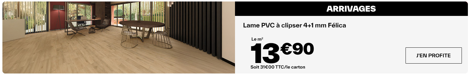 La lame PVC clipsable Pour tous types de pièces, excepté les pièces. humides Uniquement compatible avec la sous-couche spéciale sols vinyles d'épaisseur 1 mm (réf.303218) Dimensions : l. 15 x L. 93,5 cm. Ép. 3,2 mm Coloris : chêne . Couche d'usure : 0,15 mm. Clipsable 2 côtés. En paquet de 2,24 m². Finition structurée. Ce sol doit être poser dans sous-couche. Résistant. Clipsable 2 côtés Entretien : eau savonneuse ou detergent neutre. Mode d'emploi : Avant de commencer : Les cartons contenant le revêtement de sol doivent être placés non ouverts dans la pièce où le revêtement va être posé pour que ce dernier s'acclimate à la température ambiante pendant 12 heures avant la pose. Les cartons doivent être empilés soigneusement pour permettre à l'air de circuler. La température ambiante doit être maintenue entre 20°C et 25°C. Inspectez chaque carton pour vous assurer qu’il n’y a aucun défaut de fabrication. Tout défaut doit être signalé au magasin pour obtenir un remplacement du produit avant la pose du revêtement de sol. Ce sol doit être posé comme un parquet flottant et ne doit pas être collé ou fixé. Informations fournisseurs : Nom : Kingfisher International Products B.V. Adresse : Rapenburgerstraat 175E, 1011 VM Amsterdam, The Netherlands Site web : www.kingfisher.com/products