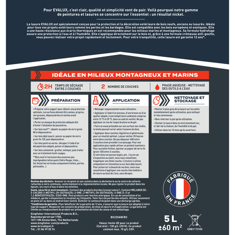 La lasure chêne clair 5 L satin protège le bois. Elle est idéale en milieux montagneux et marins, offre une barrière anti UV et imperméabilité renforcée. Préparation : Préparer votre support pour obtenir une protection optimale. Les surfaces doivent être saines, propres, non grasses, dépoussiérées et sèches avant l'application. Porter un masque de protection adéquat afin d'éviter l'inhalation de poussières. Sur bois neuf : dépolir au papier de verre grain 80. Sur bois déjà lasuré : poncer au papier de verre grain fin 120, puis dépoussiérer. Sur bois peint ou vernis : décaper à l’aide d’un décapant bois adapté, poncer et dépoussiérer. Sur bois contaminé : gratter, nettoyer, puis traiter avec le traitement multi-usage. *Bois neuf à l’exclusion des essences peu imprégnables telles que le Red Cedar, Iroko et sur boiseries verticales uniquement (volets, portes, palissades…) Application : Mélanger soigneusement avant utilisation. Appliquer par une température ambiante extérieure comprise entre 12 °C et 25 °C. Application et séchage dans un endroit ventilé. Ne pas appliquer en case de risque de pluie ou de gel. La teinte peut varier selon l’essence du bois, faire un essai préalable sur une surface non visible. Appliquer la lasure à la brosse, au pinceau ou avec un spalter. Appliquer une couche régulière et généreuse. Patienter 2H avant d’appliquer la deuxième couche. Pour une belle finition égrainer au papier de verre fin entre 2 couches. Ne pas dépasser 48H entre 2 couches sinon procéder à un ponçage. Surface de couverture : 60 m². Temps de séchage : 12 heure. Temps de recouvrement : 2 heures. Stockage : Replacez fermement le couvercle et conservez le reste de peinture dans un endroit sec à une température comprise entre 5°C et 30°C. Utiliser dans les 12 mois après ouverture. Aussi performante que simple d’utilisation… Evalux est la marque de peintures bien couvrantes, pensées pour faciliter tous vos projets : à l’intérieur comme à l’extérieur. En exclusivité chez Brico DépôtQualité, simplicité, efficacité. Evalux est la marque de peintures bien couvrantes, pensées pour faciliter tous vos projets : à l’intérieur comme à l’extérieures. Des peintures à prix imbattable. Découvrez la marque EVALUX exclusivement chez Brico Dépôt. Informations fournisseurs : Nom : Kingfisher International Products B.V. Adresse : Rapenburgerstraat 175E, 1011 VM Amsterdam, The Netherlands Site web : www.kingfisher.com/products