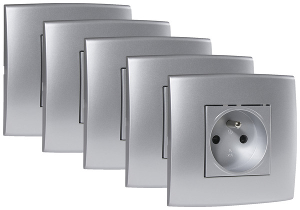 Lot de 5 prises avec terre "Kobé" silver. Informations fournisseurs : Nom : Kingfisher International Products B.V. Adresse : Rapenburgerstraat 175E, 1011 VM Amsterdam, The Netherlands Site web : www.kingfisher.com/products