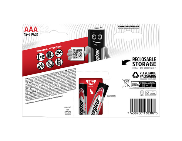 Avec le pack de 15 + 5 piles Energizer max AAA CHP, tirez le meilleur parti de vos appareils du quotidien grâce à l'énergie vous exigez de piles Energizer. Faites le plein de piles AAA pour appareils photo, lampes, télécommandes. Les piles Energizer Max AAA conservent leur autonomie, leur résistance aux fuites et protège vos appareils des coulures Ne coule pas Conservent leur performance longue-durée Informations fournisseurs : Nom : ENERGIZER FRANCE SAS Email : Kevin.Rejent@energizer.com Adresse : Immeuble Ariane, 2 rue Jacques Daguerre, 92500 Rueil Malmaison France
