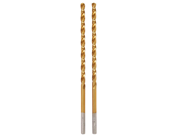 Lot de 2 forets à métaux - DRL28002. Acier forgé haute vitesse rectifié avec pointe entaillée 130° et finition enduit en titane pour perçage de précision. Utilisable sur métal, plastique, plaques de plâtres et bois.