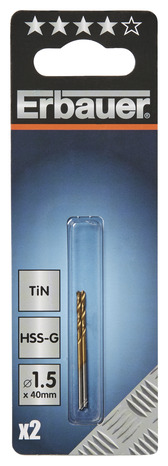 Lot de 2 forets à métaux TiN 1,5 mm 2 pk - DRL49286. Acier forgé haute vitesse rectifié avec pointe entaillée 130° et finition enduit en titane pour perçage de précision. Utilisable sur métal, plastique, plaques de plâtres et bois. Informations fournisseurs : Nom : Kingfisher International Products B.V. Adresse : Rapenburgerstraat 175E, 1011 VM Amsterdam, The Netherlands Site web : www.kingfisher.com/products