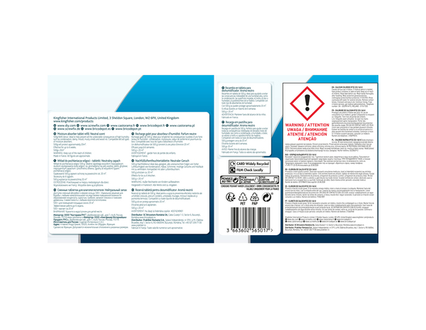 Ce lot de recharge pour absorbeur d'humidité contient 2 galets qui font chacun 11 x 11 cm pour 500 g. Ces recharges permettent l’absorption de l'humidité pour une pièce de 20 m² jusqu'à 6 semaines. Efficace, elles protègent des condensations, des moisissures et des odeurs de renfermé. Informations fournisseurs : Nom : Kingfisher International Products B.V. Adresse : Rapenburgerstraat 175E, 1011 VM Amsterdam, The Netherlands Site web : www.kingfisher.com/products