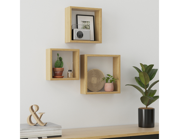Le lot de 3 cubes imitation bois 30 cm "Rabella", modèle TC4 . vous permettra de créer la tablette qui égaiera votre mur. Optimisez votre espace de rangement en utilisant la surface supérieure et l'intérieur des cubes pour disposer vos affaires. Dimensions et poids du produit (L. et H. 1x23 cm, 1x26,5 cm, 1x30 cm - P. 9,8 cm - ÉP. 15 mm), Charge max. 10 kg. Matière : MDF (panneau de fibres de bois moyenne densité). Effet chêne . Finition placage bois, aspect mat. Raccords et fixations non inclus. Assemblage non requis. Fixation murale. Vis et chevilles murales vendues séparément, à adapter en fonction du type de mur sur lequel la tablette va être fixée. Nettoyer avec un chiffon doux et humide. Utiliser le gabarit fourni pour positionner la tablette et la fixer au mur. La charge maximale indiquée peut être inférieure selon l'état du mur. Les charges doivent être réparties uniformément. Informations fournisseurs : Nom : Kingfisher International Products B.V. Adresse : Rapenburgerstraat 175E, 1011 VM Amsterdam, The Netherlands Site web : www.kingfisher.com/products
