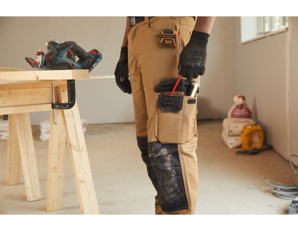 Ce pantalon à poches multiples, coupe relaxed est doté de poches pour genouillères à accès par le haut et de doubles coutures pour une durabilité accrue. Certifié conforme à la norme EN14404 en matière de protection des genoux. Comprend une sangle pour marteau, des poches zippées pour les objets de valeur, une poche pour téléphone portable et des poches non fixées pour plus de confort dans vos mouvements. Contient du polyester recyclé. Couleur : Marron/noir Pourcentages de la matière du vêtement : 65% polyester recyclé GRS, 35% coton Poids du tissu : 260 g/m² Lavable en machine 2 poches hanche avant, 2 poches latérales non fixées, 1 poche pour téléphone, 2 poches arrière Poches pour genouillères avec accès par le haut Sangle de marteauDimensions : Tour de taille : 91 cm Longueur du pied : 81 cm Garantie 2 ans Informations fournisseurs : Nom : Kingfisher International Products B.V. Adresse : Rapenburgerstraat 175E, 1011 VM Amsterdam, The Netherlands Site web : www.kingfisher.com/products