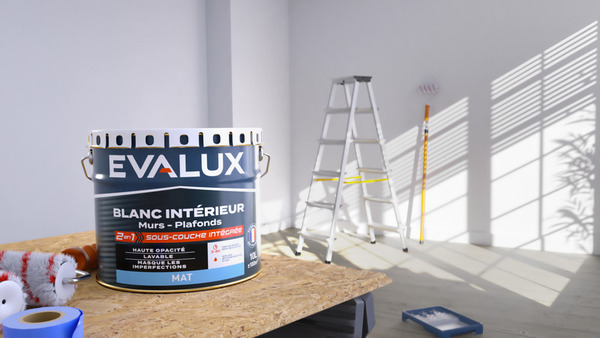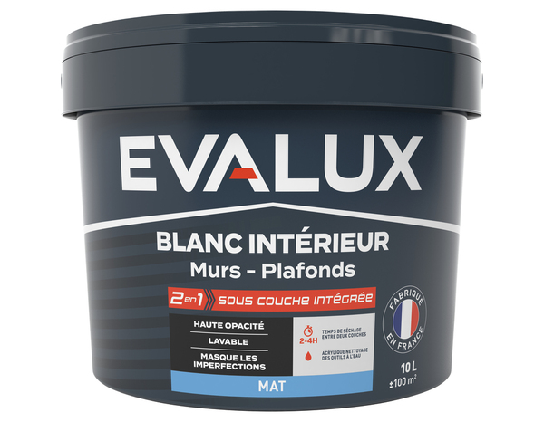 La Peinture blanche intérieure 2en1 mat à haute opacité est idéale pour les murs et les plafonds. Sa formule 2 en 1 assure un résultat optimal sur toutes les pièces intérieures de votre maison. La surface peinte est lavable, sa finition mate masque les imperfections du support. Cette peinture à l'eau, faible odeur sèche en peu de temps. Préparation : Préparer votre support pour obtenir un bon résultat. Les surfaces à peindre doivent être saines, propres et sèches. Poncer, lessiver et sécher les surfaces déjà peintes. Boucher les trous ou autres défauts avec un enduit. Application : Mélanger soigneusement la peinture avant utilisation. Appliquer à l'aide d'un pinceau ou d'un rouleau, à une température ambiante comprise entre 10°C et 25°C, et éviter les courants d'air. Appliquer deux couches de peinture pour un résultat optimal. Laisser sécher 2 à 4 heures entre deux couches. Nettoyage : Retirer le plus gros de la peinture sur les outils avec une spatule immédiatement après utilisation, puis rincer à l'eau tiède. Bien refermer le pot après utilisation. - Stocker la peinture dans un environnement sec, à l'abri de la chaleur, de l'humidité et du gel. - Utiliser dans les 12 mois après ouverture. Conseil d’entretien : Peinture lessivable, nettoyer avec de l’eau. Evalux est l’atout qualité de vos projets peinture, avec des peintures bien couvrantes, des compositions et des informations claires pour vous aider choisir vite, et bien… à prix imbattable. Découvrez la marque EVALUX en exclusivité chez Brico Dépôt. Informations fournisseurs : Nom : Kingfisher International Products B.V. Adresse : Rapenburgerstraat 175E, 1011 VM Amsterdam, The Netherlands Site web : www.kingfisher.com/products