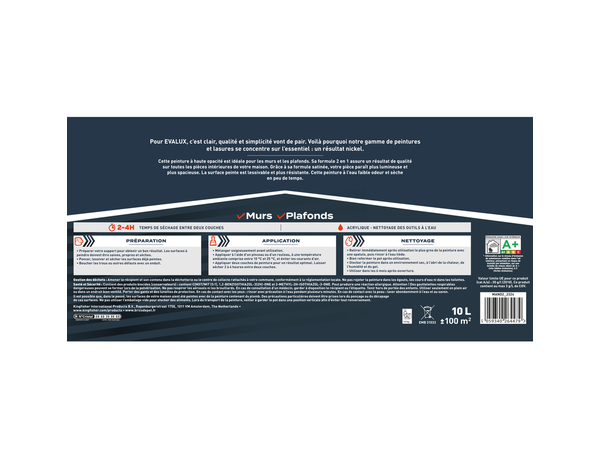 La Peinture blanche intérieure 2en1 satin à haute opacité est idéale pour les murs et les plafonds. Sa formule 2 en 1 assure un résultat de qualité sur toutes les pièces intérieures de votre maison. Grâce à sa formule satinée, votre pièce paraît plus lumineuse et plus spacieuse. La surface peinte est lessivable et plus résistante. Cette peinture à l'eau faible odeur sèche en peu de temps. Préparation : Préparer votre support pour obtenir un bon résultat. Les surfaces à peindre doivent être saines, propres et sèches. Poncer, lessiver et sécher les surfaces déjà peintes. Boucher les trous ou autres défauts avec un enduit. br> Application : Mélanger soigneusement la peinture avant utilisation. Appliquer à l'aide d'un pinceau ou d'un rouleau, à une température ambiante comprise entre 10°C et 25°C, et éviter les courants d'air. Appliquer deux couches de peinture pour un résultat optimal. Laisser sécher 2 à 4 heures entre deux couches. Nettoyage : Retirer le plus gros de la peinture sur les outils avec une spatule immédiatement après utilisation, puis rincer à l'eau tiède. Bien refermer le pot après utilisation. Stocker la peinture dans un environnement sec, à l'abri de la chaleur, de l'humidité et du gel. Utiliser dans les 12 mois après ouverture. Conseil d’entretien : Peinture lessivable, nettoyer avec de l’eau. Aussi performante que simple d’utilisation… Evalux est une marque de peinture toute fraiche vendue exclusivement chez Brico Depot… à prix imbattable. Découvrez la marque EVALUX en exclusivité chez Brico Dépôt. Informations fournisseurs : Nom : Kingfisher International Products B.V. Adresse : Rapenburgerstraat 175E, 1011 VM Amsterdam, The Netherlands Site web : www.kingfisher.com/products