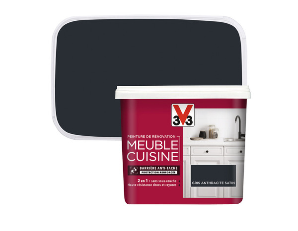 La peinture de rénovation meubles cuisine acrylique satin gris anthracite 0,75 L spécialement conçue pour les meubles de cuisine très sollicités. Formule à base aqueuse offrant une haute adhérence sans sous-couche. Résistance optimale aux taches, chocs, rayures et frottements pour une protection durable. Finition satinée gris anthracite élégante et tendue parfaitement. Fabrication française avec un respect de l’environnement certifié par l’Ecolabel. Contenance : 0,75 L Rendement : 12 m²/l, surface de couverture 10 m² Temps de séchage au toucher : 6 heures, séchage complet en 24 heures Nombre de couches recommandées : 2 Usage : bois nu, verni ou peint, mélaminé, stratifié, carrelage, plâtre, verre Résistance : eau, taches, chocs, rayures, frottements Nettoyage des outils : à l’eau Température d’application : entre 12°C et 25°C Lavable et ultra lessivable Inclus : bac à peinture et additif à mélanger avant application Support : meubles de cuisine, crédences, plans de travail Type de peinture : acrylique satinée à base d’eau, écolabel Marque : V33, fabrication française Mode d’emploi : nettoyer la surface avec savon noir ou à la soude, ajouter l’additif fourni et bien mélanger avant application au pinceau, spalter ou rouleau.