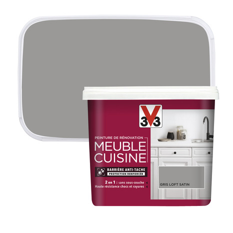 La peinture de rénovation meubles cuisine acrylique satin gris galet 0,75 L est une peinture acrylique satinée spécialement conçue pour la rénovation des meubles de cuisine. Couleur gris galet élégante, offrant une finition satinée moderne et durable. Résiste efficacement à l'eau, aux chocs et ne jaunit pas avec le temps. Séchage rapide au toucher en 6 heures, séchage complet en 24 heures. Facile à appliquer au pinceau, spalter ou rouleau, elle est ultra lessivable pour un entretien simplifié. Contenance : 0,75 L Rendement : 12 m² par litre, soit environ 10 m² par pot Nombre de couches recommandées : 2 Type de peinture : A base d’eau, écologique avec classe d’émission COV A Support : Bois nu, verni ou peint, mélaminé, stratifié, carrelage, plâtre, verre Temps de traitement complet : 20 jours Température d’application : entre 12°C et 25°C Nettoyage des outils : à l’eau Inclus : bac à peinture et additif à mélanger dans la peinture avant application Fabrication française, poids du produit 837 g Finition satinée gris loft, adaptée au mobilier de cuisine Résistante aux taches, lavable et durable dans le temps