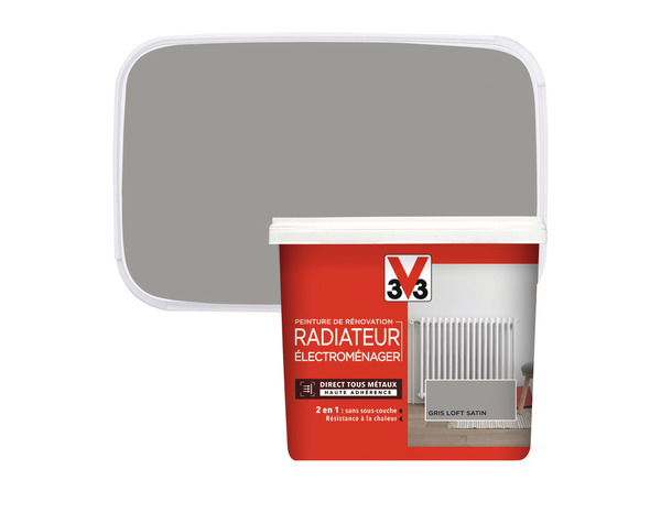 La peinture de rénovation Radiateur & Électroménager V33 est idéale pour redonner un coup de neuf à vos appareils de chauffage et électroménagers avec une finition satinée gris loft élégante. Sa formule à base aqueuse garantit une haute adhérence sur tous types de métaux et PVC, sans besoin de sous-couche. Elle résiste à la chaleur jusqu’à 100°C, ne jaunit pas et offre une excellente résistance aux chocs et à l’eau. Facile à appliquer au pinceau, spalter ou rouleau, cette peinture sèche rapidement et est ultra lessivable pour un entretien simplifié. Fabriquée en France, elle allie performance et respect de l’environnement avec une faible émission de COV. Contenance : 0,75 L Couleur : Gris loft satinée Usage : Radiateurs, chauffages électriques, tuyaux de chauffage central, électroménagers (réfrigérateurs, lave-vaisselle) Supports compatibles : Métaux ferreux (fonte, fer), non ferreux (aluminium, cuivre, inox), PVC, supports peints Temps de séchage au toucher : 6 heures, séchage complet : 24 heures Nombre de couches : 2 Rendement : 10 à 12 m² par litre Résistance : Chaleur jusqu’à 100°C, eau, chocs, taches Application : Pinceau, spalter, rouleau Nettoyage des outils : À l’eau Classe d’émission COV : A (faible émission) Fabrication : France Conditionnement : Pot plastique avec additif inclus pour préparation optimale Conseils d’application : Nettoyer la surface avec savon noir ou soude, ajouter l’additif au mélange, appliquer sur support lessivé et rincé Entretien : Compatible avec tous produits d’entretien chimiques