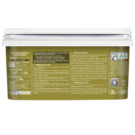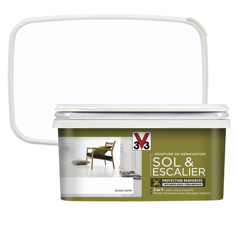 La peinture de rénovation sol et escalier acrylique satin blanc 2 L est une peinture de rénovation acrylique satinée spécialement conçue pour sols et escaliers. Idéale pour les surfaces carrelées, bois, stratifié et pierres naturelles. Résistante à l'eau et aux passages fréquents, elle offre une finition blanche satinée durable. Séchage rapide avec un toucher sec en 3 heures et un séchage complet en 24 heures. Facile à appliquer et ultra lessivable, elle ne jaunit pas et s'entretient aisément. Contenance : 2 litres Rendement : 10 m² par litre, soit 20 m² par pot Nombre de couches recommandées : 2 Type de peinture : Acrylique à base d'eau, finition satinée blanche Temps de séchage au toucher : 3 heures Temps de séchage complet : 24 heures Temps de traitement final : 20 jours Résistance : à l'eau, aux taches et au passage intensif Classe d’émissions de COV : A+ (faible émission dans l’air intérieur) Supports compatibles : carrelage en grès émaillé, bois verni ou peint, stratifié, pierre naturelle (marbre, granit) Conseils d’application : appliquer entre 12°C et 25°C, sur support propre, lessivé et rincé Nettoyage des outils : à l’eau Inclus : bac à peinture Origine : fabriquée en France Adaptée à toutes les pièces, y compris humides.