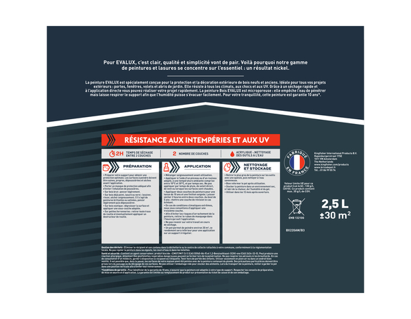 La peinture extérieur bois 2,5 L vert mousse satin est idéalee pour vos espaces extérieurs. Elle offre un excellent pouvoir couvrant et extrêmement résistante aux intempéries et UV. Préparation : La surface à peindre doit être propre et sèche avant l'application. Application : mélanger soigneusement la peinture avant utilisation. Appliquer à l'aide d'un pinceau ou d'un rouleau, à une température ambiante comprise entre 10°C et 30°C et éviter les courants d'air. Appliquer une ou deux couches de peinture pour des résultats optimaux. Surface de couverture : 30 m². Temps de séchage : 24 heures. Temps de recouvrement : 4 heures. Rendement : 12 m²/L. Stockage : Replacez fermement le couvercle et conservez le reste de peinture dans un endroit sec à une température comprise entre 5°C et 30°C. Utiliser dans les 12 mois après ouverture. Conseil d'entretien : Utilisez une éponge humide et un peu de liquide vaisselle. Aussi performante que simple d’utilisation… Evalux est la marque de peintures bien couvrantes, pensées pour faciliter tous vos projets : à l’intérieur comme à l’extérieur. En exclusivité chez Brico DépôtEvalux est l’atout qualité de vos projets peinture, avec des peintures bien couvrantes, des compositions et des informations claires pour vous aider choisir vite, et bien… à prix imbattable. Découvrez la marque EVALUX en exclusivité chez Brico Dépôt. Informations fournisseurs : Nom : Kingfisher International Products B.V. Adresse : Rapenburgerstraat 175E, 1011 VM Amsterdam, The Netherlands Site web : www.kingfisher.com/products