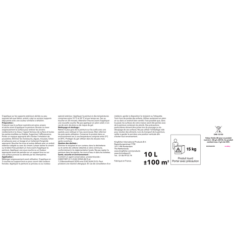 La peinture extérieur façade 10 L ton pierre mat est résistante aux intempéries et UV. Elle s'applique sur béton, crépi, enduit et pierre Préparation : La surface à peindre doit être propre et sèche avant l'application. Application : mélanger soigneusement la peinture avant utilisation. Appliquer à l'aide d'un pinceau ou d'un rouleau, à une température ambiante comprise entre 10°C et 30°C et éviter les courants d'air. Appliquer une ou deux couches de peinture pour des résultats optimaux. Surface de couverture : 100 m². Temps de séchage : 24 heures. Rendement : 10 m²/L Stockage : Replacez fermement le couvercle et conservez le reste de peinture dans un endroit sec à une température comprise entre 5°C et 30°C. Utiliser dans les 12 mois après ouverture. Qualité, simplicité, efficacité. Evalux est la marque de peintures bien couvrantes, pensées pour faciliter tous vos projets : à l’intérieur comme à l’extérieures. Des peintures à prix imbattable. Découvrez la marque EVALUX exclusivement chez Brico Dépôt. Informations fournisseurs : Nom : Kingfisher International Products B.V. Adresse : Rapenburgerstraat 175E, 1011 VM Amsterdam, The Netherlands Site web : www.kingfisher.com/products