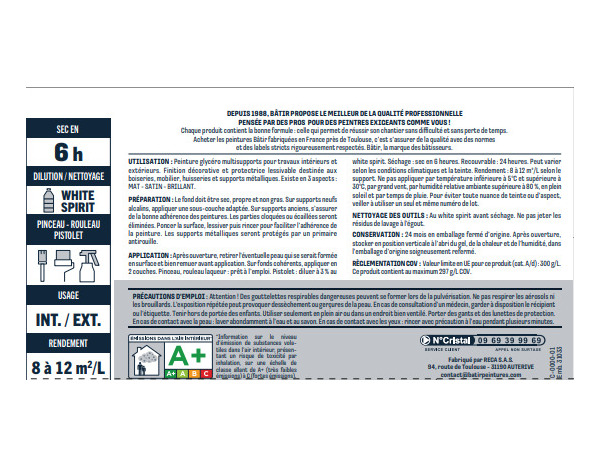 Peinture laque glycero multisupports 0,5 L - Noir satin est destinée aux boiseries, mobiliers, huisseries et supports métalliques. Préparation Le fond doit être sec, propre et exempt de corps gras. Les anciennes peintures seront convenablement poncées et lessivées. Éliminer toutes les parties non adhérentes. Sur support pulvérulent, appliquer une couche de fixateur. Les métaux ferreux seront recouverts d’un primaire antirouille après élimination de la rouille. Application : Bien mélanger avant application. Sur fonds cohérents, appliquer deux couches. Ne pas appliquer par température inférieure à 5°C et supérieure à 30°C, par humidité relative ambiante supérieure à 80 %, par grand vent, en plein soleil et par temps de pluie. Rendement : 8 à 12 m²/L en fonction du support à traiter. Informations fournisseurs : Nom : RECA SAS Email : contact@reca.tm.fr Adresse : 94 route de toulouse 31190 AUTERIVE