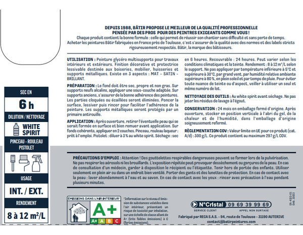 Peinture laque glycero multisupports 2,5 L - Blanc brillant est destinée aux boiseries, mobiliers, huisseries et supports métalliques. Préparation Le fond doit être sec, propre et exempt de corps gras. Les anciennes peintures seront convenablement poncées et lessivées. Éliminer toutes les parties non adhérentes. Sur support pulvérulent, appliquer une couche de fixateur. Les métaux ferreux seront recouverts d’un primaire antirouille après élimination de la rouille. Application : Bien mélanger avant application. Sur fonds cohérents, appliquer deux couches. Ne pas appliquer par température inférieure à 5°C et supérieure à 30°C, par humidité relative ambiante supérieure à 80 %, par grand vent, en plein soleil et par temps de pluie. Rendement : 8 à 12 m²/L en fonction du support à traiter. Informations fournisseurs : Nom : RECA SAS Email : contact@reca.tm.fr Adresse : 94 route de toulouse 31190 AUTERIVE