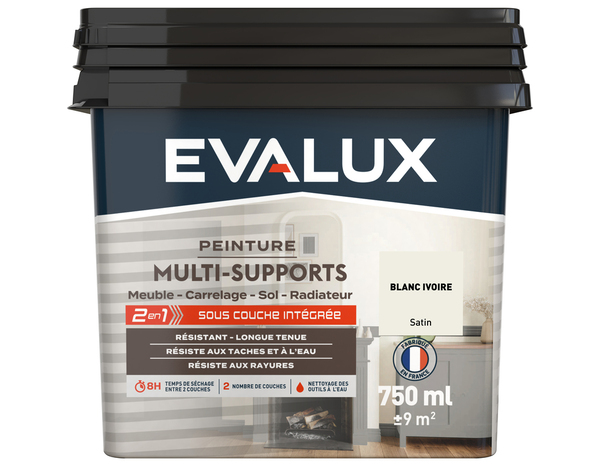 La peinture multi-supports Satin 0,75 L Blanc Ivoire Conseils d'utilisation : Préparation de la dosette : Vider complètement l'additif (la dosette dans le bac de l'applicateur) dans le pot de peinture et mélanger avec un bâtonnet large pendant 5 minutes, en insistant sur le fond du pot afin d'homogénéiser le produit. Une fois l'additif ajouté à la peinture, le mélange doit être utilisé dans les 10 jours pour assurer une adhérence et une résistance optimales. Préparation : Laver la surface avec un produit à base de soude et la rincer soigneusement ; éliminer les moisissures avec un produit antimoisissure. Les surfaces doivent être dépoussiérées. Bois : éliminer la cire et l'huile. Combler les trous avec du mastic à bois. Bien poncer la surface avant de peindre. Sur le bois tannique, commencer par appliquer une sous-couche appropriée. Carrelage : retirer tous les joints en silicone avant de peindre. Il est possible de refaire les joints après avoir appliqué la peinture. Stratifié, mélaminé, PVC, support déjà peint ou verni et métal : laver, rincer abondamment à l'eau claire et laisser sécher. Poncer ensuite légèrement (grain 240) et dépoussiérer. Informations fournisseurs : Nom : Kingfisher International Products B.V. Adresse : Rapenburgerstraat 175E, 1011 VM Amsterdam, The Netherlands Site web : www.kingfisher.com/products