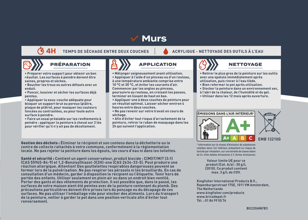 La peinture Evalux beige calcaire est idéale pour vos espaces intérieurs, même pour les pièces à fort trafic comme les couloirs, les escaliers et les chambres d'enfants. Elle offre un excellent pouvoir couvrant, elle est lessivable et extrêmement résistante à l'usure. Grace à la formule satinée, votre pièce paraît plus lumineuse et plus spacieuse. Elle s'applique sur plâtre, plaques de plâtre, revêtements à peindre et anciennes peintures. Préparation : Préparer votre support afin d'obtenir un bon résultat. Les surfaces à peindre doivent être saines, propres et sèches. Application : Mélanger soigneusement la peinture avant utilisation. Appliquer à l'aide d'un pinceau ou d'un rouleau, à une température ambiante comprise entre 10°C et 30°C et éviter les courants d'air. Appliquer une ou deux couches de peinture pour des résultats optimaux. Nettoyage : Retirer le plus gros de la peinture sur les outils avec une spatule immédiatement après utilisation, puis rincer à l'eau tiède. Bien refermer le pot après utilisation. Stocker la peinture dans un environnement sec, à l'abri de la chaleur, de l'humidité et du gel. Utiliser dans les 12 mois après ouverture. Conseil d’entretien :Peinture lessivable, nettoyer avec de l’eau. Aussi performante que simple d’utilisation… Evalux est une marque de peinture toute fraiche vendue exclusivement chez Brico Depot… à prix imbattable. Découvrez la marque EVALUX en exclusivité chez Brico Dépôt. Informations fournisseurs : Nom : Kingfisher International Products B.V. Adresse : Rapenburgerstraat 175E, 1011 VM Amsterdam, The Netherlands Site web : www.kingfisher.com/products