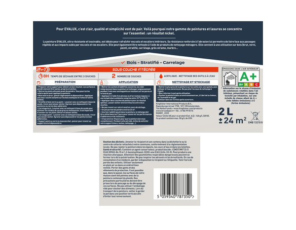 La peinture sol et escalier Mat 2 L Gris Acier est ultra résistante et lessivable, est idéale pour rafraîchir vos sols et escaliers intérieurs. Sa résistance renforcée à l'abrasion lui permettra de faire face aux passages répétés et aux impacts subis par vos sols et vos escaliers. Elle peut également être nettoyée à l'aide de produits de nettoyage ménagers. Elle convient à une utilisation sur bois ( brut, verni, peint), stratifié, céramique et carreaux de pierre carrelage, grès cérame, marbre Conseils d'utilisation : Retirer le sachet d'additif du couvercle, le vider intégralement dans la peinture et mélanger soigneusement pendant 2 min avec une baguette en insistant sur les parois et le fond du pot. Appliquer à l'aide d'un pinceau ou d'un rouleau laqueur, à une température ambiante comprise entre 10 °C et 25 °C Appliquer deux couches de peinture pour un résultat optimal. Laisser sécher environ 8 heures entre deux couches. Ne pas revenir sur votre travail en cours de séchage. Un pot permet de peindre environ 24 m². Une fois l'additif ajouté dans la peinture, le mélange doit être utilisé dans les 7 jours pour conserver les performances d'adhérence et de résistance. Il faut environ 10 jours pour que la peinture durcisse complètement. Pendant cette période, évitez de solliciter votre support (chocs, taches, nettoyage...) Préparation : Préparer votre support pour obtenir un bon résultat. Les surfaces à peindre doivent être saines, propres et sèches. Retirez les joints siliconés avant de peindre. Vous pourrez les refaire après avoir appliqué la peinture Bois neuf ou brut: poncer légèrement et dépoussiérer. Appliquer une sous-couche isolante sur les bois exotiques et riches en tanins (chêne) Stratifié et bois verni ou peint : Lessiver avec un nettoyant à base de soude, rincer puis laisser sécher. Egrener puis dépoussiérer les peintures ou vernis bien adhérents. Carrelage brut: Lessiver avec un nettoyant à base de soude pour éliminer les résidus de corps gras ou moissisures. Il est important d'insister sur les joints. Rincer et laisser sécher Carrelage peint: Lessiver avec un nettoyant à base de soude, rincer puis laisser sécher. Egrener puis dépoussiérer les peintures bien adhérentes Support peint ou verni en mauvais état : poncer pour revenir au support brut et dépoussiérer Informations fournisseurs : Nom : Kingfisher International Products B.V. Adresse : Rapenburgerstraat 175E, 1011 VM Amsterdam, The Netherlands Site web : www.kingfisher.com/products