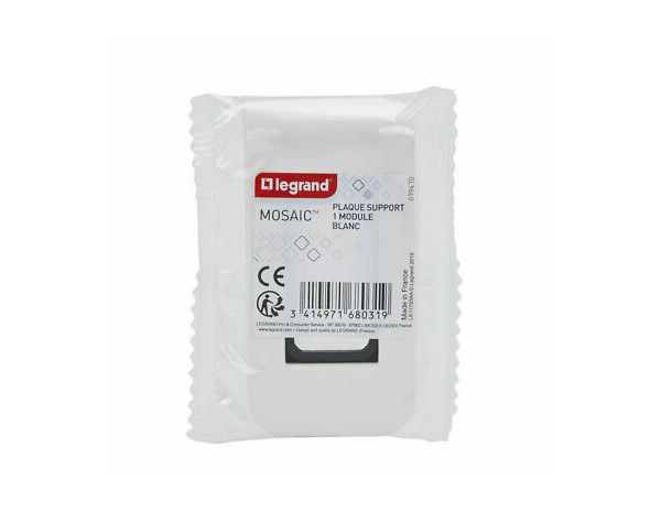Cette plaque avec support pour 1 module "Mosaic" - Blanc est une plaque de finition, à clipser Nombre d'unités : 1 Sens de montage - horizontal. Matériau : plastique Encastré Forme du produit : rectangleDimensions : Profondeur : 8,5mm ; Hauteur : 82mm; Largeur : 40mm. Fourni avec support Mosaic Garantie 2 ans.
