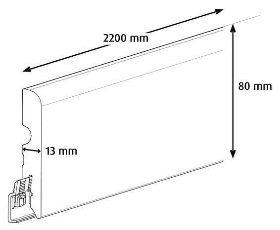 Plinthe décor 60. Couleur gris bois . Matière : panneau de fibres de bois (MDF). Dimensions : longueur 2,2m, hauteur 80 mm, épaisseur 13 mm. Système de fixation : clips de fixation ou clous ou colle. Adapté pour recouvrir le joint de dilatation, cache les câbles, protège le mur des chocs.