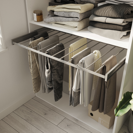 Le porte-pantalons coulissant Homny L.100 X P.58 cm. Couleur : gris. Charge maximale : 13,75 Kg. Nombre de barres : 11. Dimensions : Profondeur : 510 mm. Hauteur : 52 mm. Largueur : 964 mm. Effet métalique. Résistant à la rouille. Roulement à billes. Compatible avec des meubles de profondeur 58cm x largeur 100cm. Disponible dans une large gamme de styles et de designs, la collection HOMNY est une solution modulable de meubles de rangement qui peut s'adapter dans tout l'espace disponible, quelle que soit la forme de la pièce Cuisine, salle de bain, WC, sols, luminaires, rangements… Aménager, équiper et décorer chaque pièce de la maison avec des produits de qualité : les produits Cooke & Lewis. Découvrez toute la gamme de produits de la marque COOKE & LEWIS disponible chez Brico Dépôt. Informations fournisseurs : Nom : Kingfisher International Products B.V Adresse : Rapenburgerstraat 175E, 1011 VM Amsterdam, The Netherlands Site web :www.kingfisher.com/products