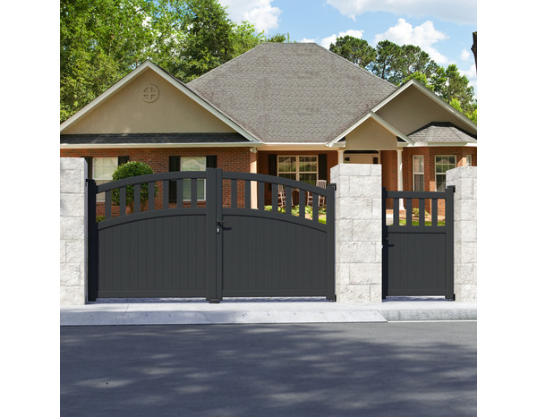 Portillon aluminium modèle "Lugo", coloris gris anthracite (RAL 7016). Largeur du portillon : 1 m Largeur nécessaire entre piliers : 1,04 m Hauteur : De 1,40 m à 1,60 m. Montants : 96 x 54 mm. Traverses : 90 x 36 mm. Lames verticales larg. 100 mm. Gonds pivots réglables anodisés. Avec quincaillerie, poignée et serrure + 2 clés fournies. Peut être vendu avec les poteaux aluminium (RAL 7016). Quincaillerie garantie 2 ans(A). Certifié CE.
