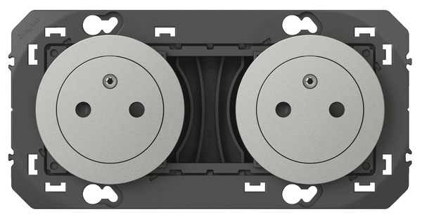 "DOOXIE". Mécanisme double de prises de courant 2 Pôles + Terre 16A à bornes automatiques. Puissance 3 680 W sous 230 V. Couleur aluminium.