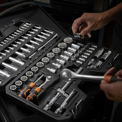 La dernière étape consiste à compléter et équiper vos établis, servantes et chariots d’atelier avec des outils à main ou électroportatifs. Pour une organisation optimale, rangez vos outils à main légers dans les tiroirs ou compartiments du haut et votre outillage électroportatif plus lourd en bas. Chaque détail sera à prendre en compte pour aménager votre atelier. Une organisation par tiroir sera utile pour vos différents travaux. Vous pouvez privilégier le rangement des petites pièces comme votre quincaillerie ou petits outils dans les plus petits tiroirs. Pour les plus gros outils, placez les au-dessus de la servante, sur le plateau ou dans les grands tiroirs.