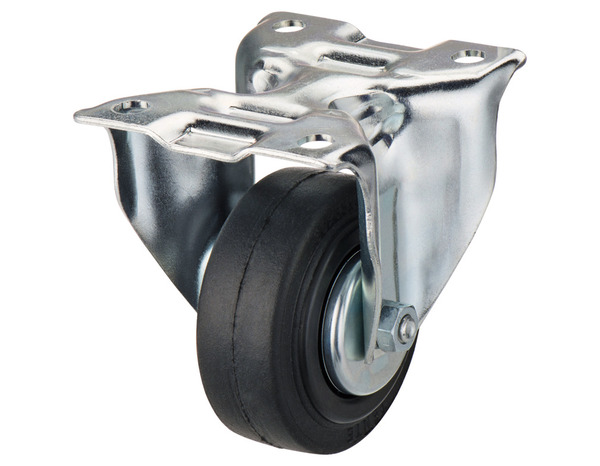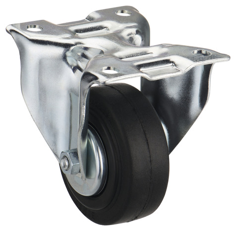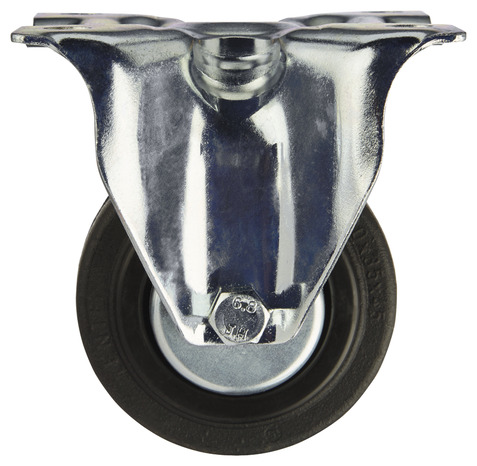 Roulette pivotante Ø 80 mm. Monture zinguée, roue caoutchouc noir. Charge maxi 70 kg. Fixation platine 105 x 85 mm. Pour chariots d'atelier.
