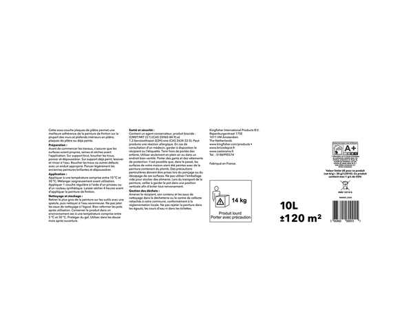 La sous-couche blanche GoodHome de 10 L, s'applique en intérieur sur des plaques de plâtre brut ou sur des murs déjà peints avec d'anciennes peintures à l'acrylique ou à la glycéro. Avant d'appliquer la sous-couche, assurez-vous que la surface est propre et sèche. Bouchez les trous et autres imperfections avec un enduit approprié. L'application de ce produit nécessite 2 couches qui peuvent être appliquées à 2 h d'intervalle. Cette sous-couche permet une meilleure adhérence pour votre peinture de finition. Ce produit a un rendement de 12 m²/L, sèche en surface en 1 h et en profondeur en 4 h. Informations fournisseurs : Nom : Kingfisher International Products B.V. Adresse : Rapenburgerstraat 175E, 1011 VM Amsterdam, The Netherlands Site web : www.kingfisher.com/products