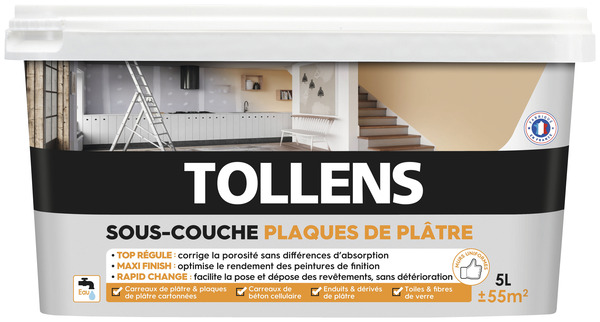 La sous-couche blanche pour plaques de plâtre Tollens de 10 L, peut s'appliquer sur les plaques de plâtre en intérieur. Avant d'appliquer la sous-couche, assurez-vous que la surface est propre et sèche. Bouchez les trous et autres imperfections avec un enduit approprié. Cette sous-couche est facile à appliquer et va couvrir les imperfections de votre surface en formant une couche protectrice. Ce produit a un rendement de 11 m²/L. Sec au toucher: 30min. Recouvrable 6h. Informations fournisseurs : Nom : Tollen Email : service-client@cromology.com Adresse : 12 Cours Michelet 92800 Puteaux France