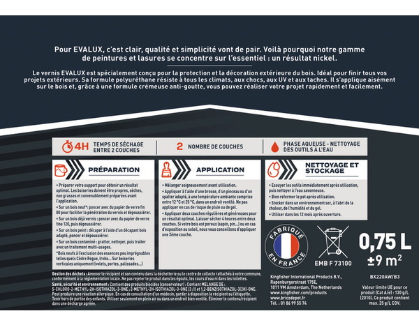 Le vernis extérieur incolore mat 0,75 L en polyuréthane, anti-taches et anti-graisse. extrêmement résistant aux intempéries et aux UV. Préparation : La surface à peindre doit être propre et sèche avant l'application. Application : Mélanger soigneusement avant utilisation. Appliquer par une température ambiante extérieure comprise entre 12 °C et 25 °C. Application et séchage dans un endroit ventilé. Ne pas appliquer en case de risque de pluie ou de gel. Stocker à l’abri du gel. Le vernis est prêt a l’emploi. Appliquer le vernis à la brosse, au pinceau ou avec un spalter. Appliquer une couche régulière et généreuse. Patienter 4H avant d’appliquer la 2ieme couche. Astuce : en extérieur, si votre bois est poreux (sapin, pin…) ou en cas d’exposition sud ou ouest, nous vous conseillons d’appliquer une 3ieme couche. Surface de couverture : 9 m². Temps de séchage : 12 heures. Temps de séchage au touché : 2 heures. Temps de recouvrement : 4 heures. Nettoyage : Retirer le plus gros du produit sur les outils avec une spatule immédiatement après utilisation, puis nettoyer à l'eau savonneuse. Conserver le produit dans un endroit sec à une température comprise entre 5 °C et 30 °C. Protéger du gel. A utiliser dans les 12 mois après ouverture. Décapage : : Préparer votre support pour obtenir un résultat optimal. Les boiseries doivent être propres, sèches, non grasses et convenablement préparées avant l'application. Sur un bois neuf*: Egrener avec un papier abrasif grain 80 pour faciliter la pénétration du vernis. Sur un bois déjà vernis : poncer avec du papier de verre fine 120, puis dépoussiérer. Sur un bois peint : décaper à l’aide d’un décapant bois adapté, poncer et dépoussiérer. Sur un bois contaminé : gratter, nettoyer, puis traiter avec un traitement multi-usages. *Bois neuf à l’exclusion peu imprégnables tells que le Red Cedar, Iroko. Sur boiseries verticales uniquement (volets, portes, palissades…) Stockage : Replacez fermement le couvercle et conservez le reste de peinture dans un endroit sec à une température comprise entre 5°C et 30°C. Nous recommandons de l'utiliser l'année suivant l'ouverture. Aussi performante que simple d’utilisation… Evalux est la marque de peintures bien couvrantes, pensées pour faciliter tous vos projets : à l’intérieur comme à l’extérieur. En exclusivité chez Brico DépôtAussi performante que simple d’utilisation… Evalux est une marque de peinture toute fraiche vendue exclusivement chez Brico Depot… à prix imbattable. Découvrez la marque EVALUX en exclusivité chez Brico Dépôt. Informations fournisseurs : Nom : Kingfisher International Products B.V. Adresse : Rapenburgerstraat 175E, 1011 VM Amsterdam, The Netherlands Site web : www.kingfisher.com/products